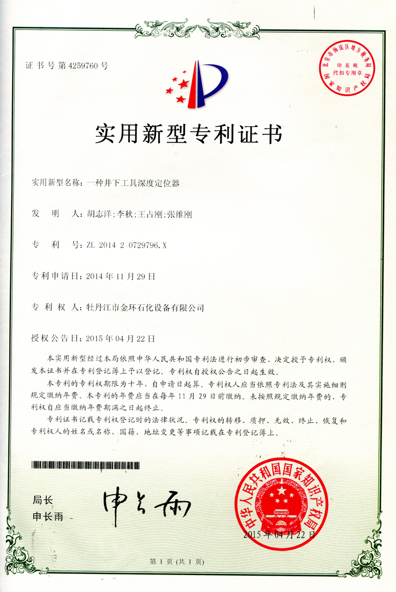 一種井下工具深度定位器實(shí)用新型專(zhuān)利證書(shū)ZL 2014 2 0729796.X